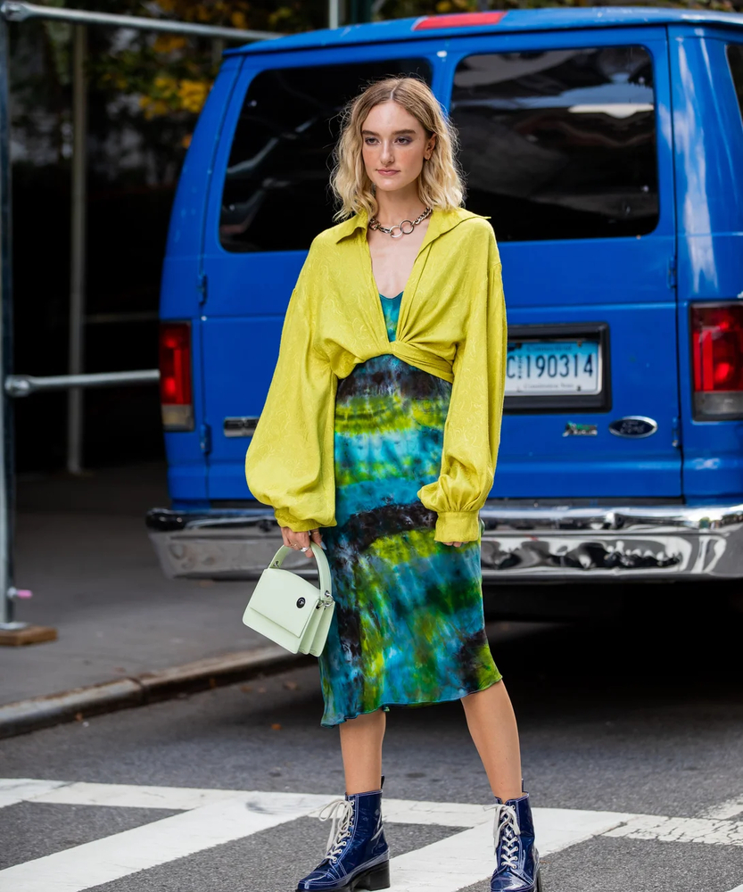 Pare „prea vesel” până îl vezi pus bine. Refinery29 nota exact genul ăsta de energie cromatică în street style: rozuri puternice, galbene soft, portocalii intense, albastru electric.