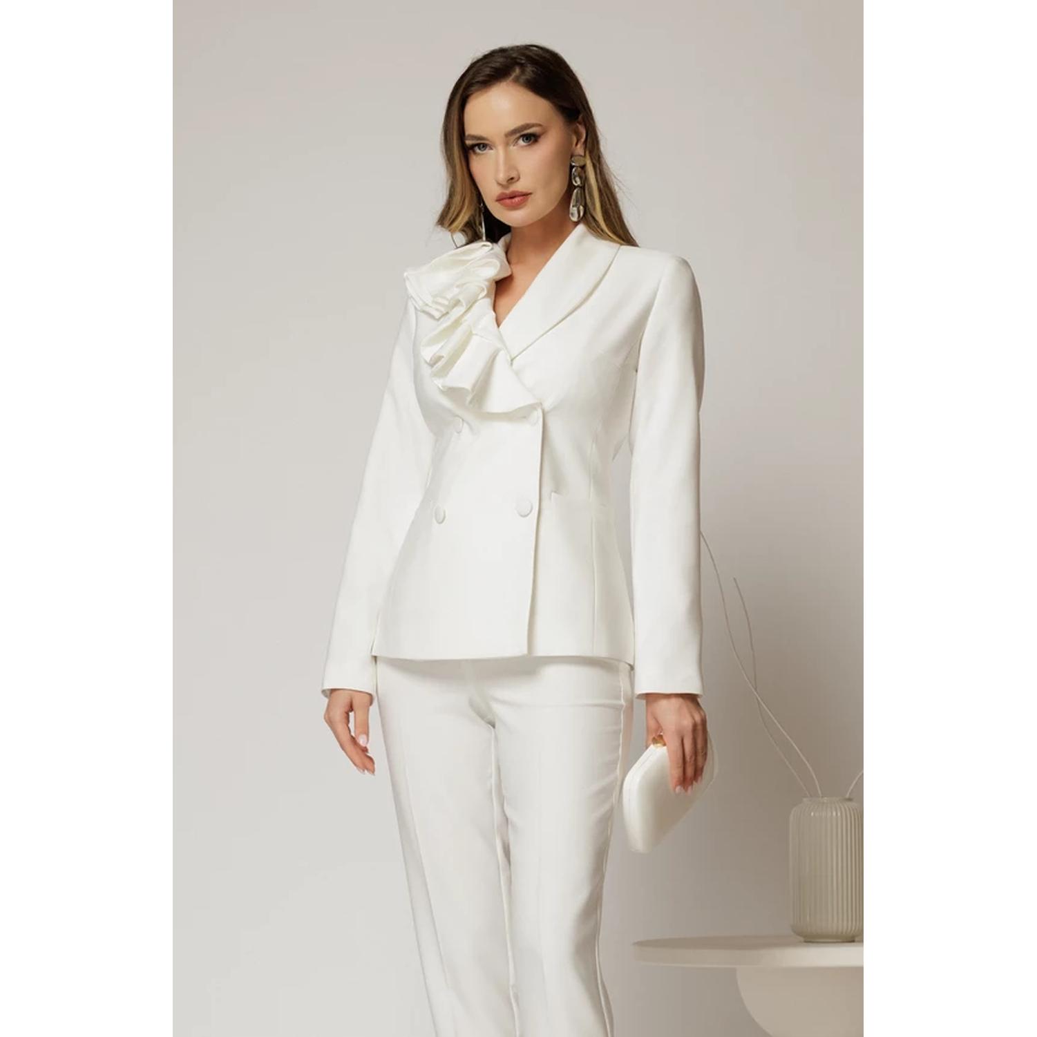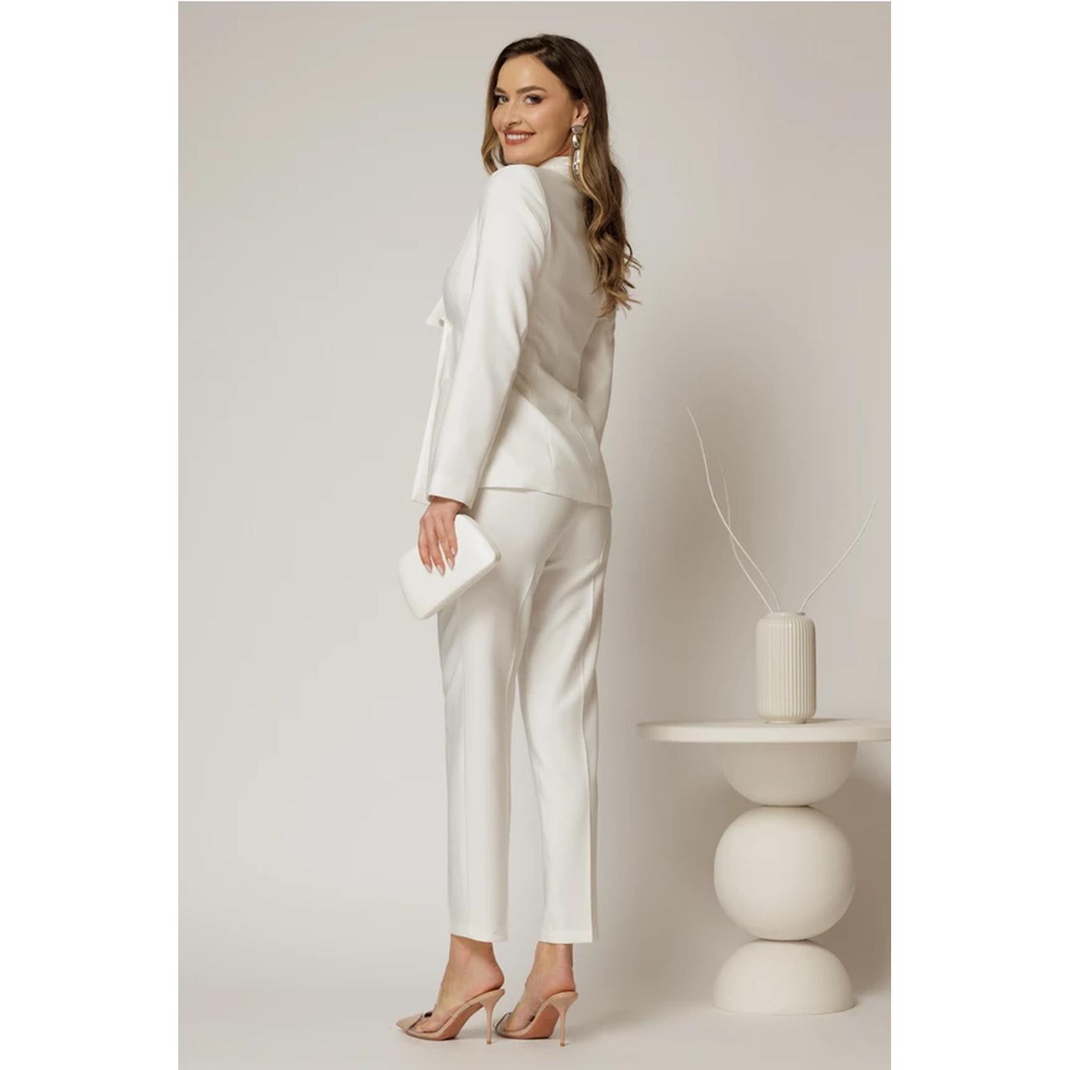 - Costum damă alb din stofă, cu pantalon și sacou cu detaliu feminin la rever, ideal pentru apariții elegante sau cununie civilă.
