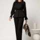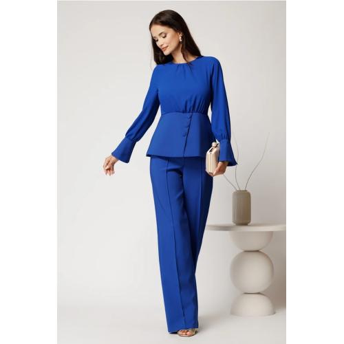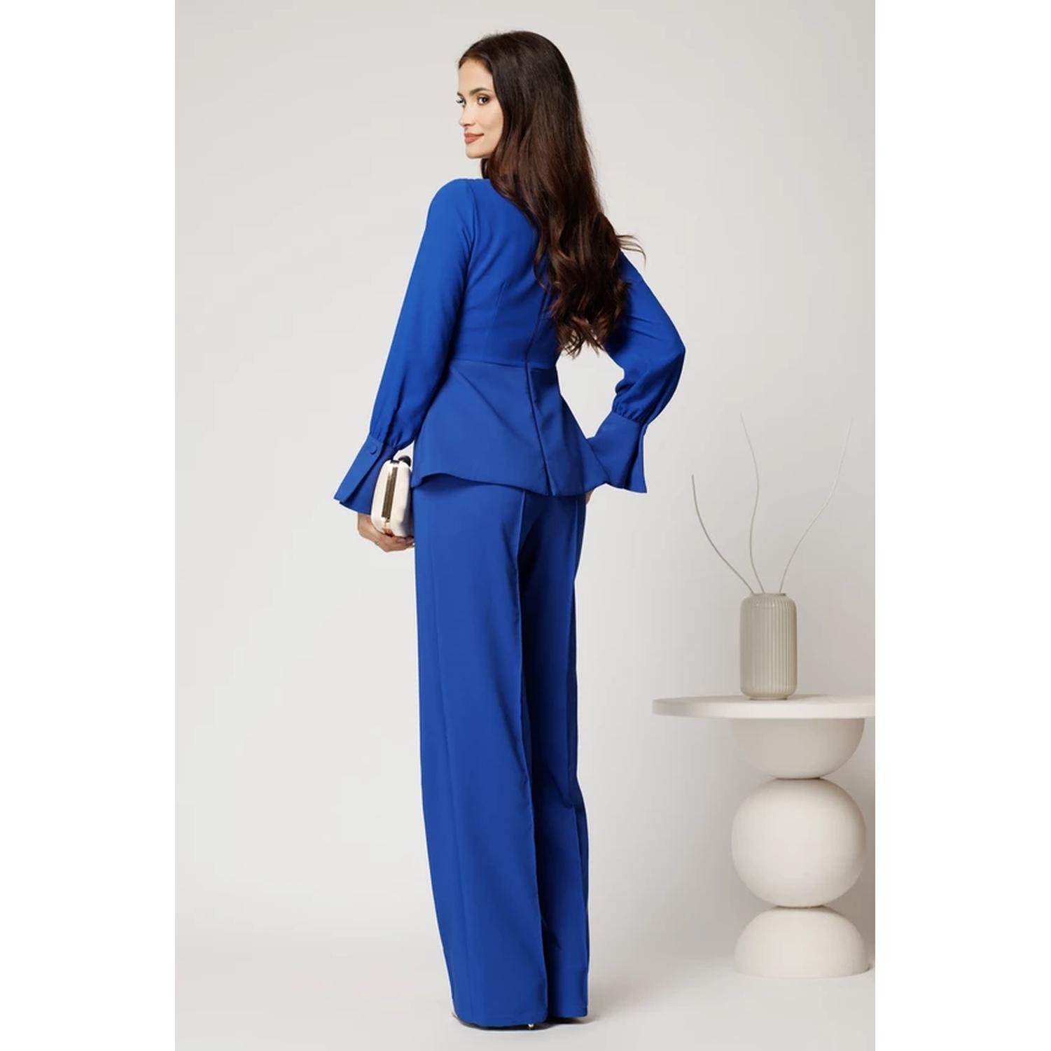 - Costum damă albastru intens, cu bluză tip peplum și pantalon, ideal pentru apariții elegante, feminine și foarte bine conturate.