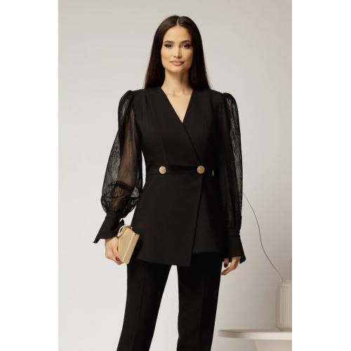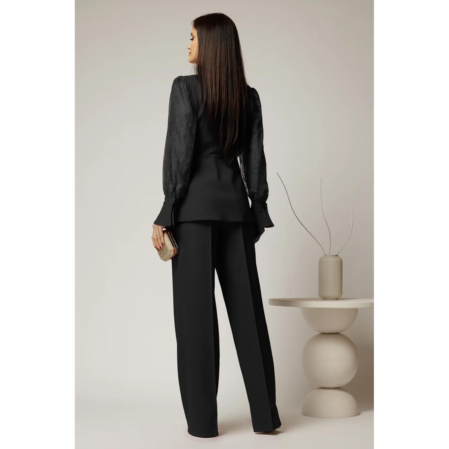 - Costum dama cu pantaloni largi și sacou cambrat cu mâneci din dantelă – eleganță couture, cu romantism fin.