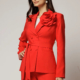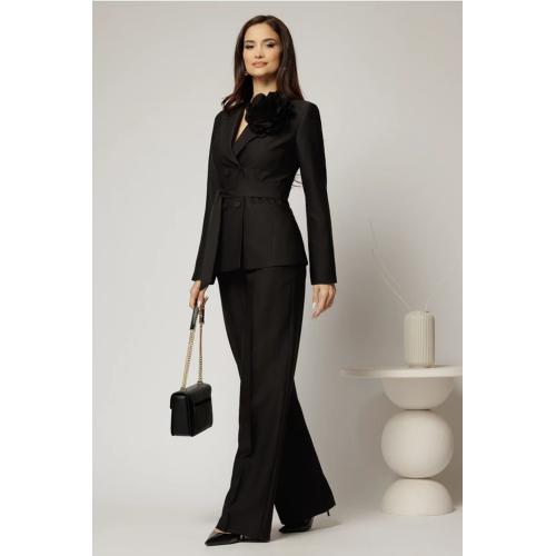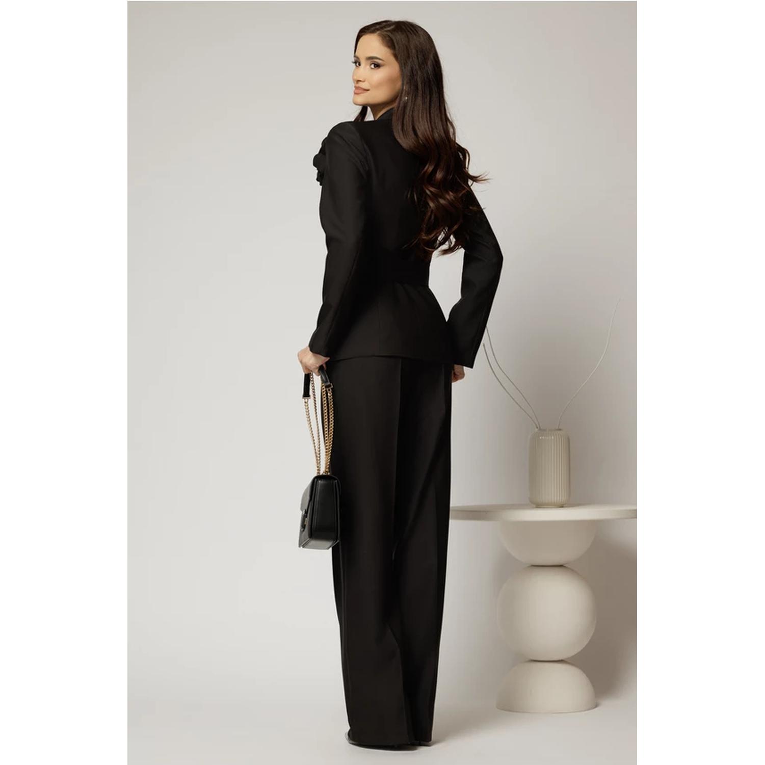 - Costum de damă cu pantaloni largi și sacou cambrat + broșă florală – eleganță couture, cu romantism fin.