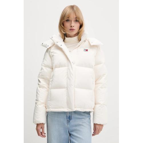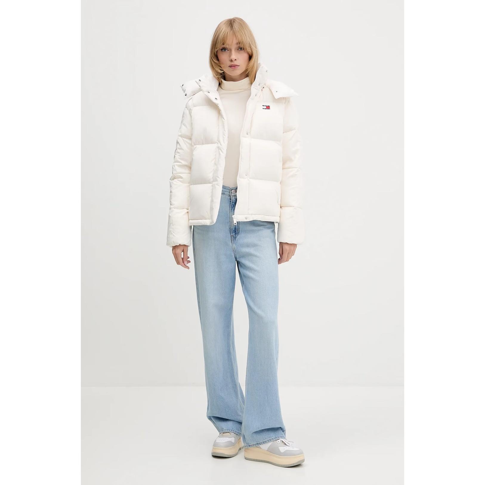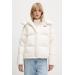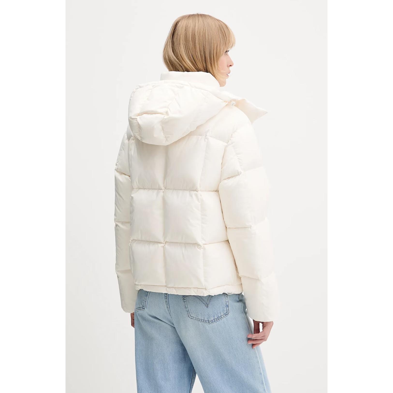 - Geaca alba cu puf natural, model cu gluga detașabilă.