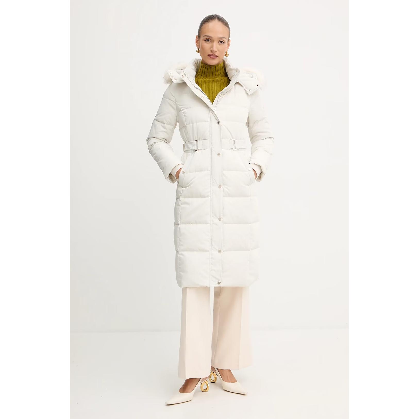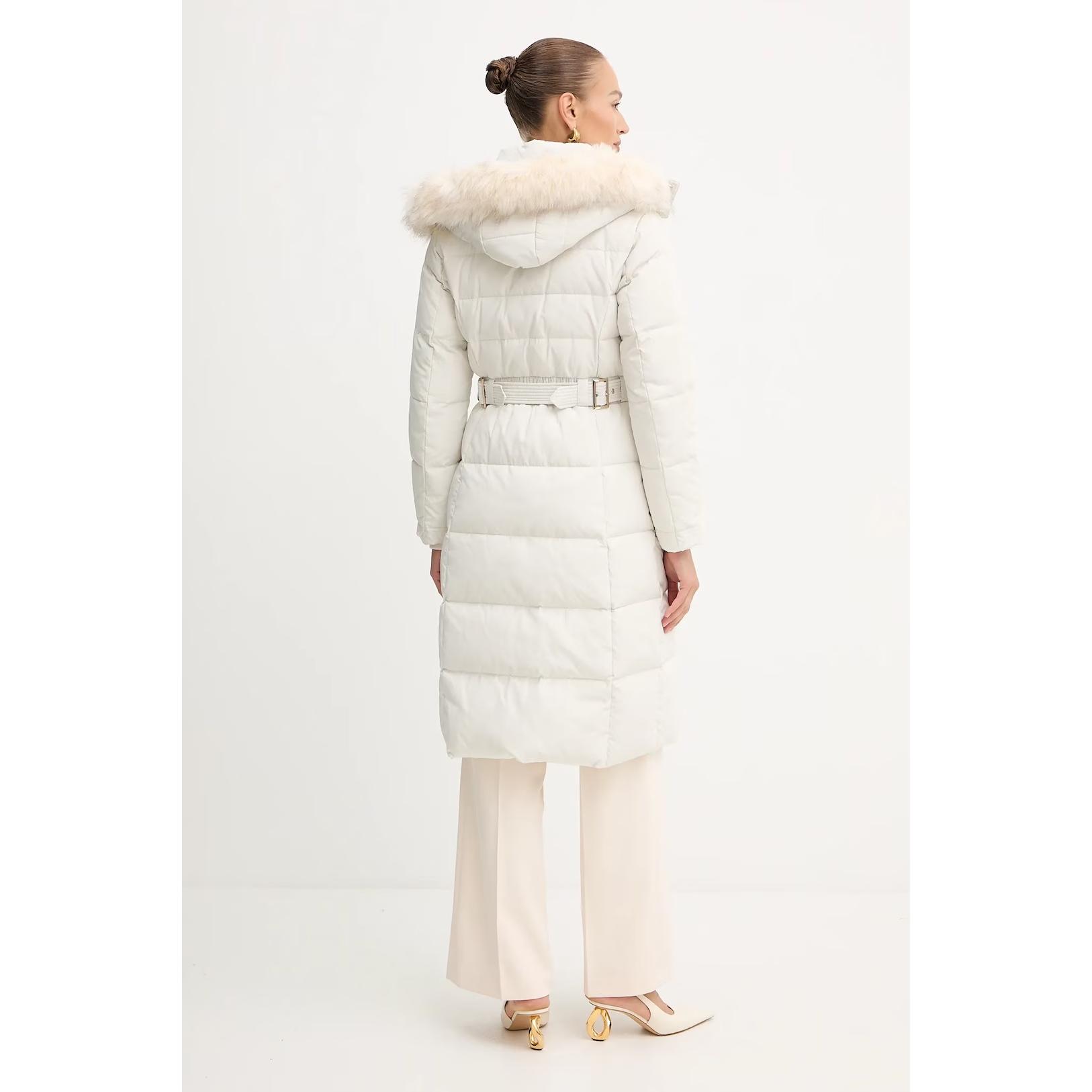 - Geaca lunga cu umplutura din pene si puf natural si gluga cu blanita artificiala, detasabila.