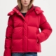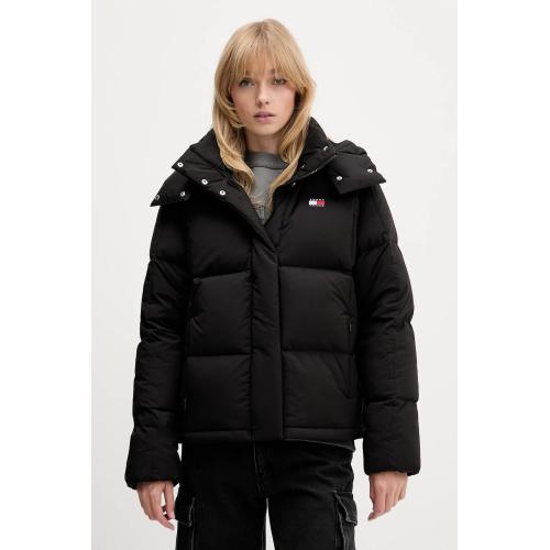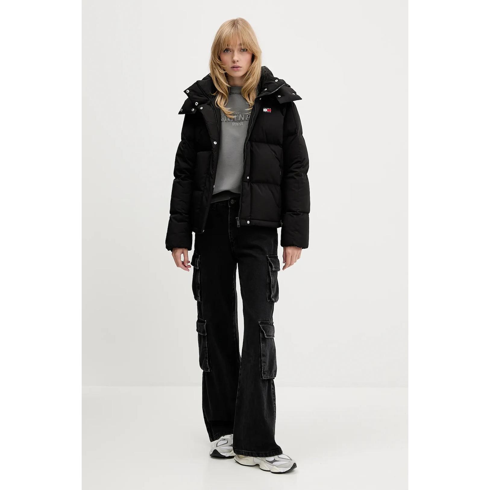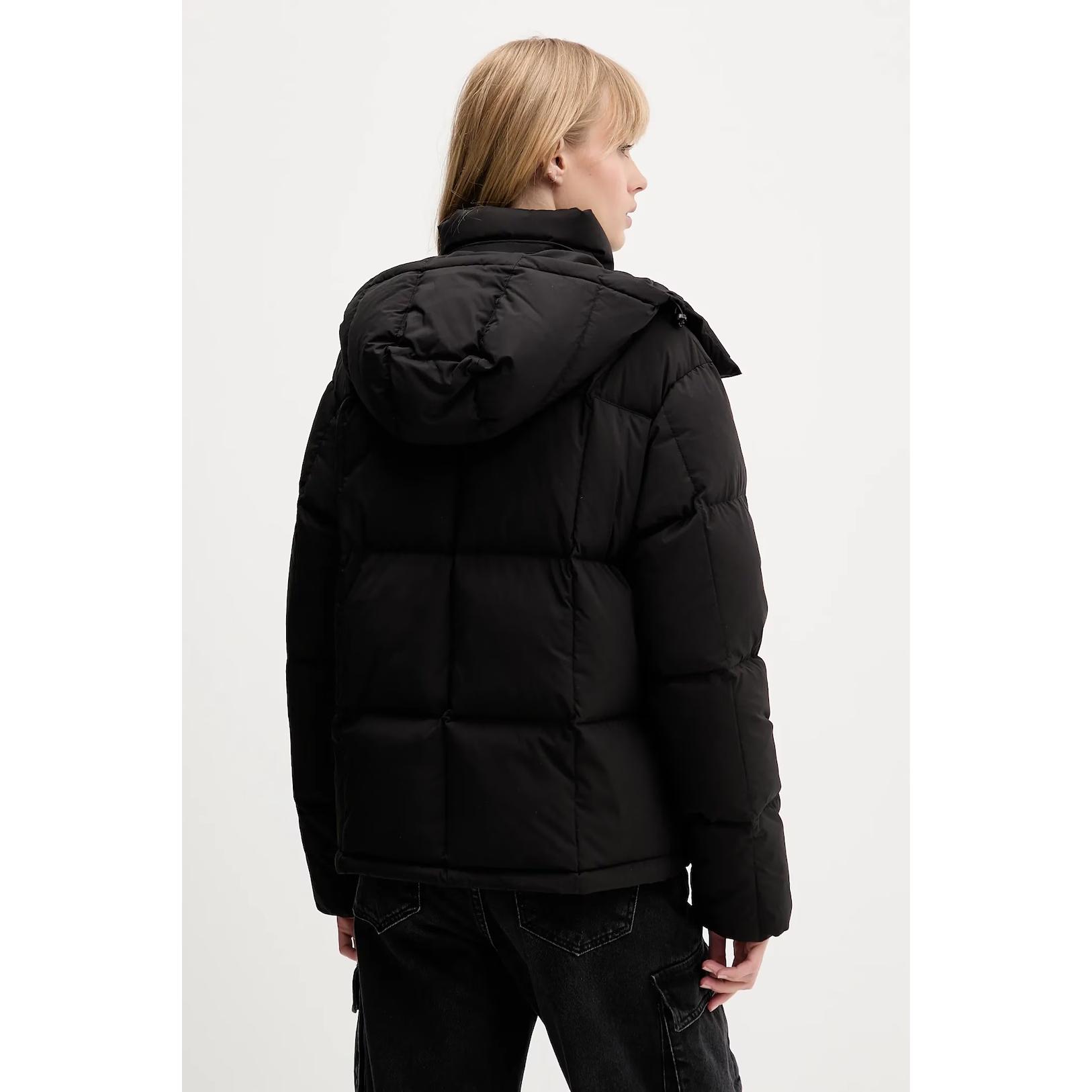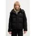 - Geaca neagră cu puf natural, model cu gluga detașabilă.