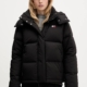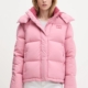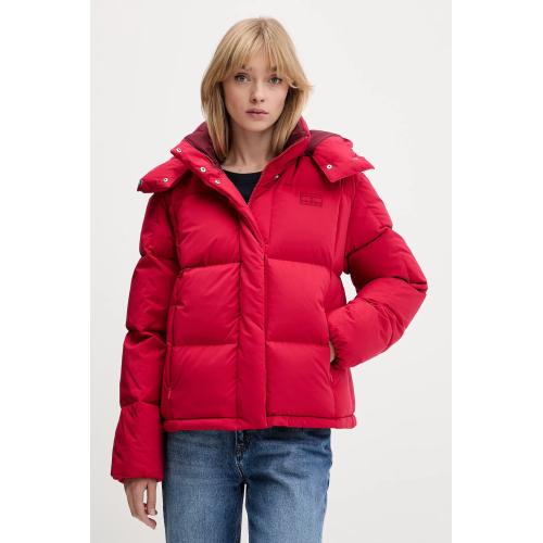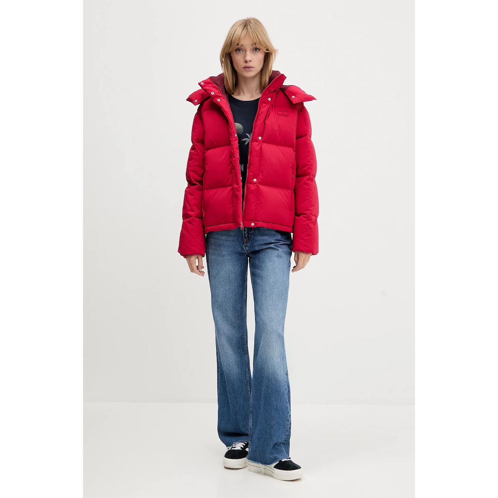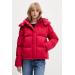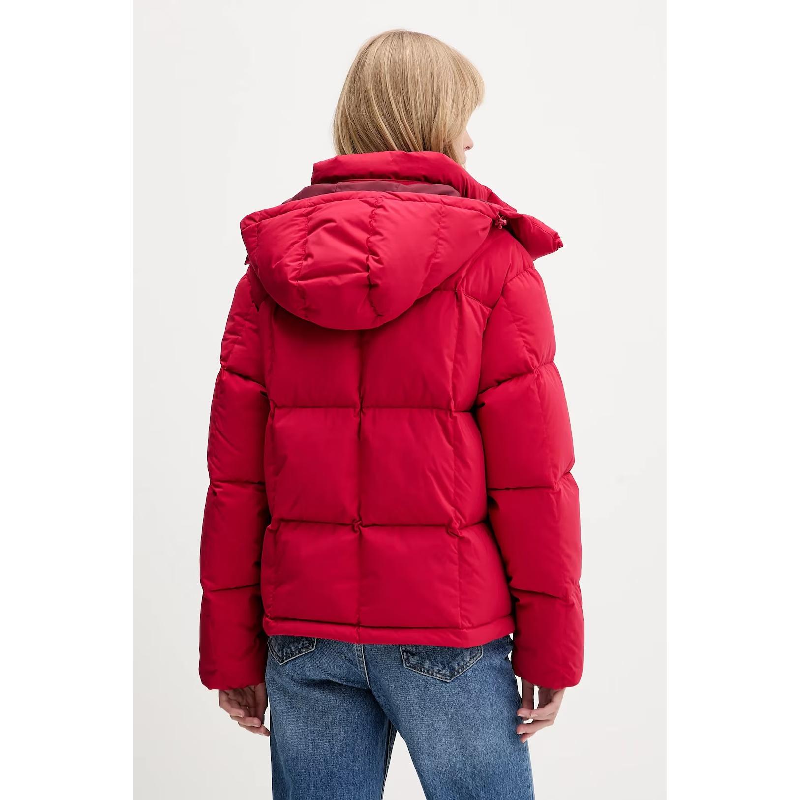 - Geaca rosie cu puf natural, model cu gluga detașabilă.