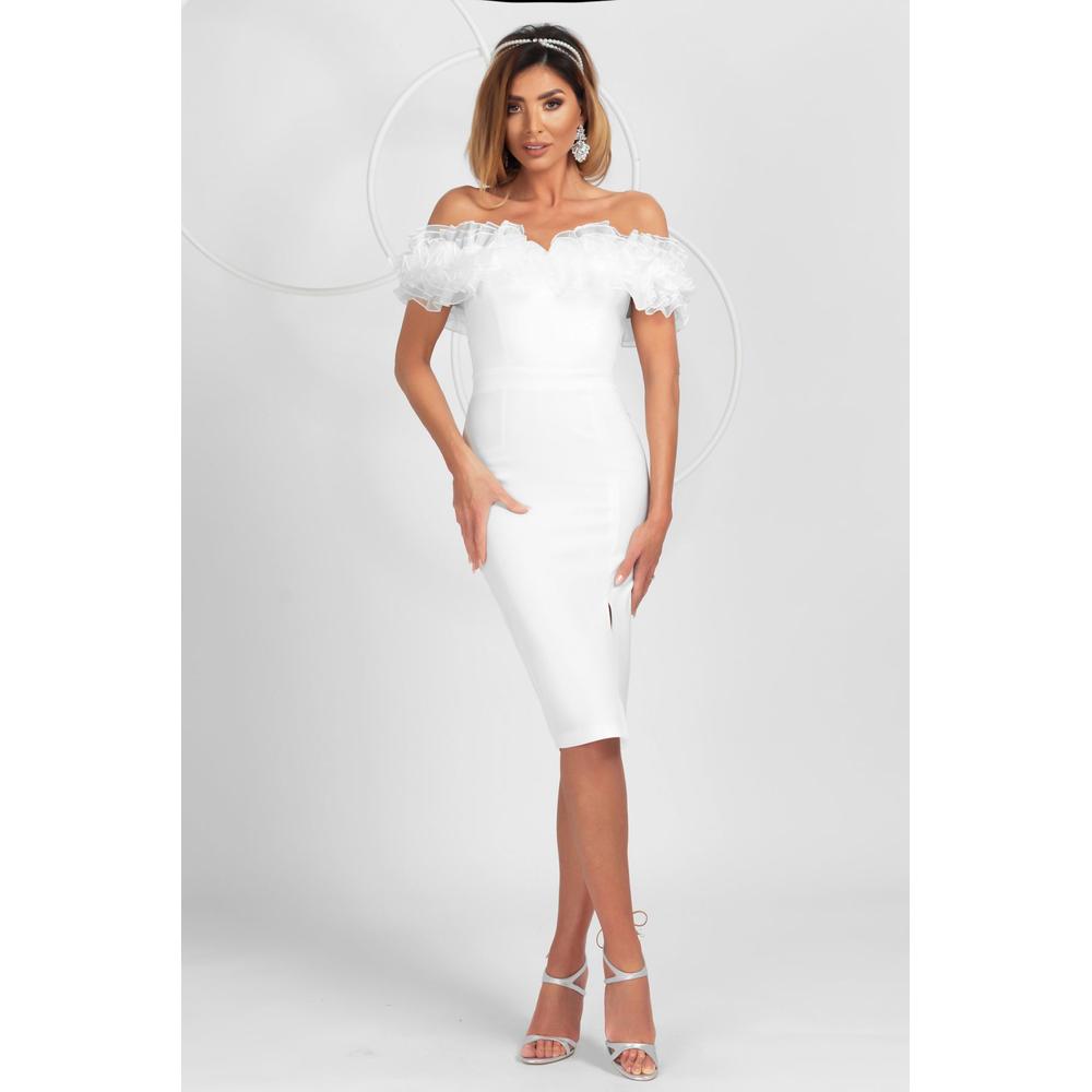 - De ce merită: • croială cambrată + țesătură ușor elastică pentru fit frumos • volănașe din organza = efect diafan, super feminin • crăpătură pe picior pentru mișcare și un touch sexy-elegant, fără să fie too much.