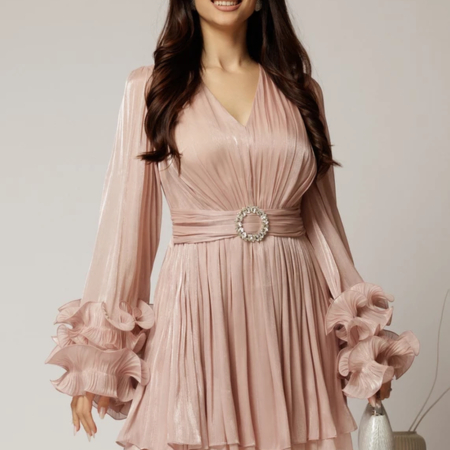 - Rochie de ocazie scurtă alba cu mâneci lungi – cununie core: romantică, curată și ultra-elegantă.