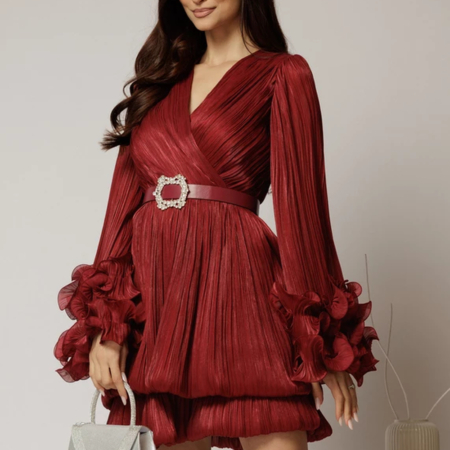 - Rochie de ocazie scurtă albastra smarald cu mâneci lungi – un glow de seară: bust decorat, talie marcată, fustă care dansează.