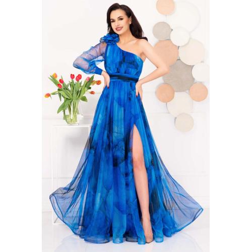 • Rochie lunga de ocazie  din  voal albastru cu imprimeu diversificat.