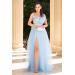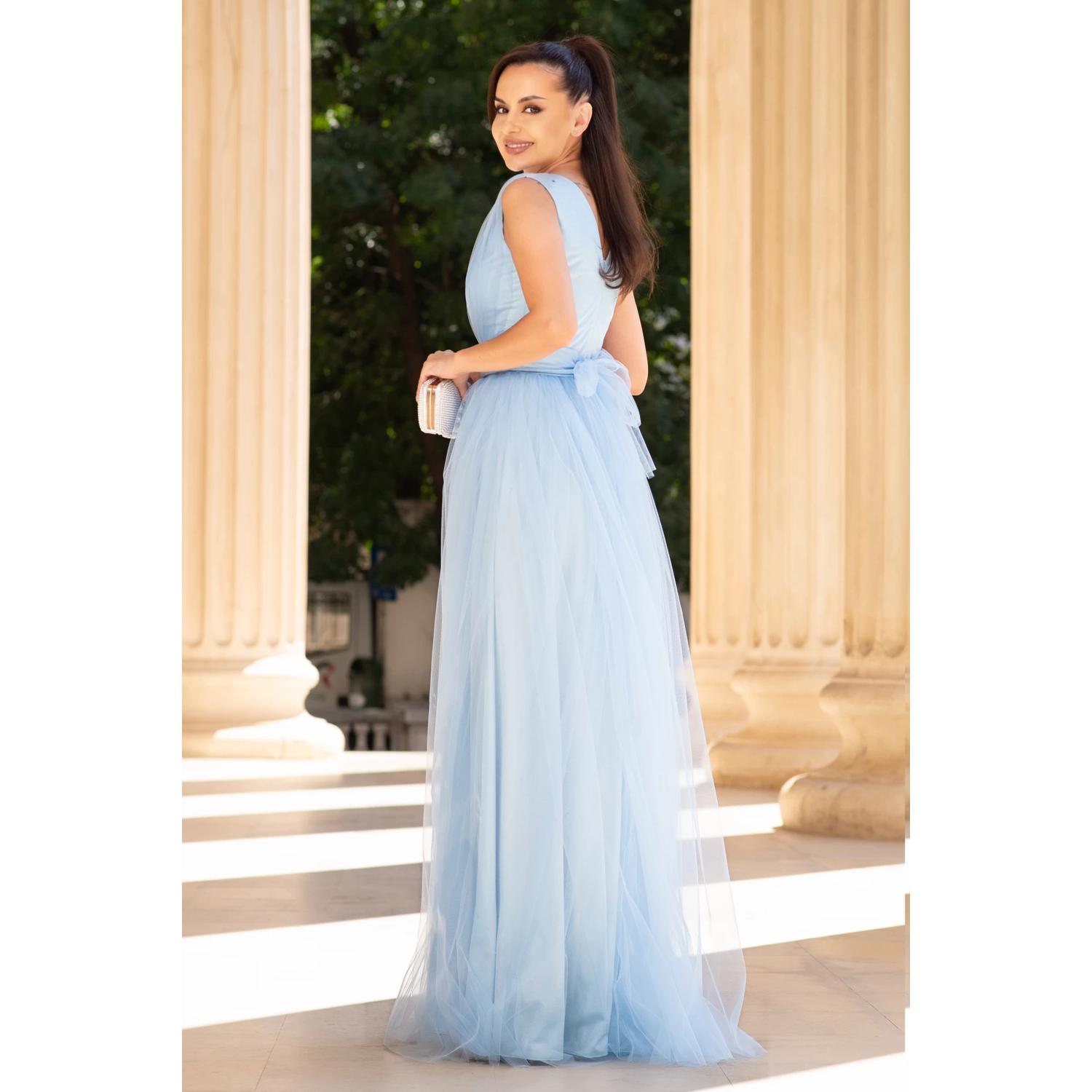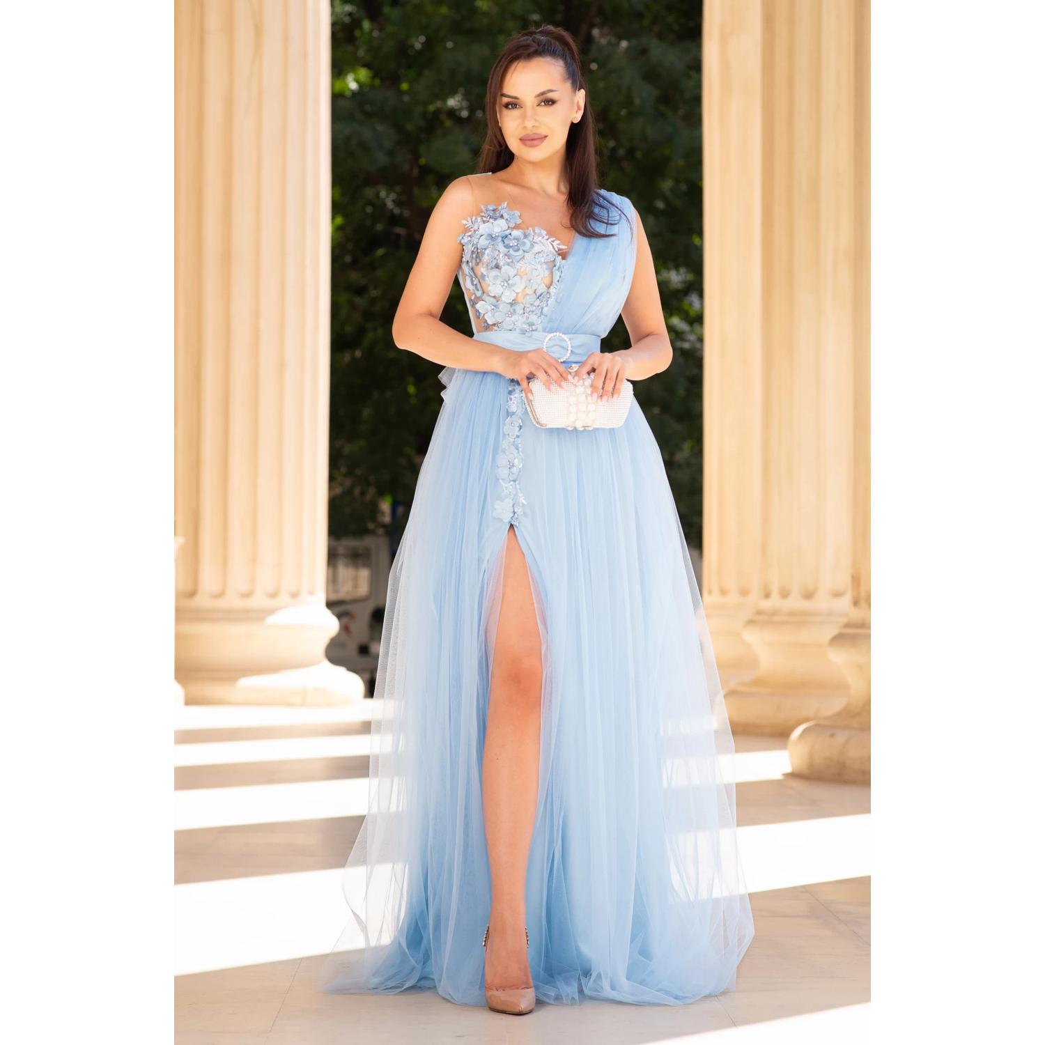 - Rochie lunga de ocazie lungă – tulle-ul diafan, florile aplicate la piept fac din ea “momentul” serii.