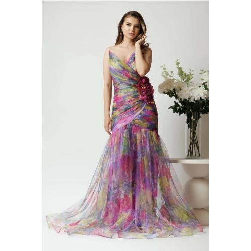 • Rochie lunga de ocazie model sirenă,  din tul mov cu imprimeuri galbene si floare maxi pe talie.
