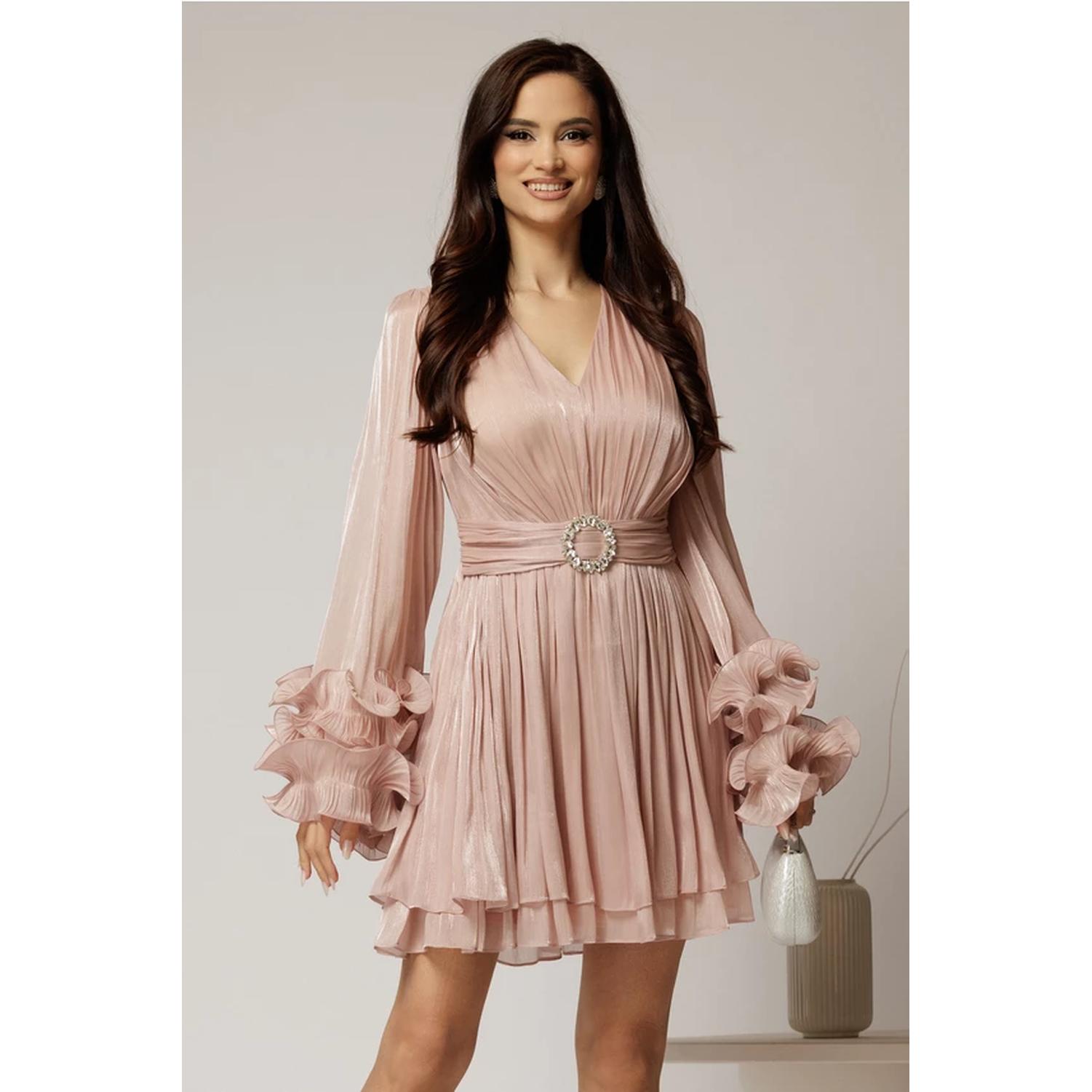 • Rochie scurtă roz pudra de seară din voal cu mâneci ample și falduri spectaculoase, pentru o apariție feminină și sofisticată.