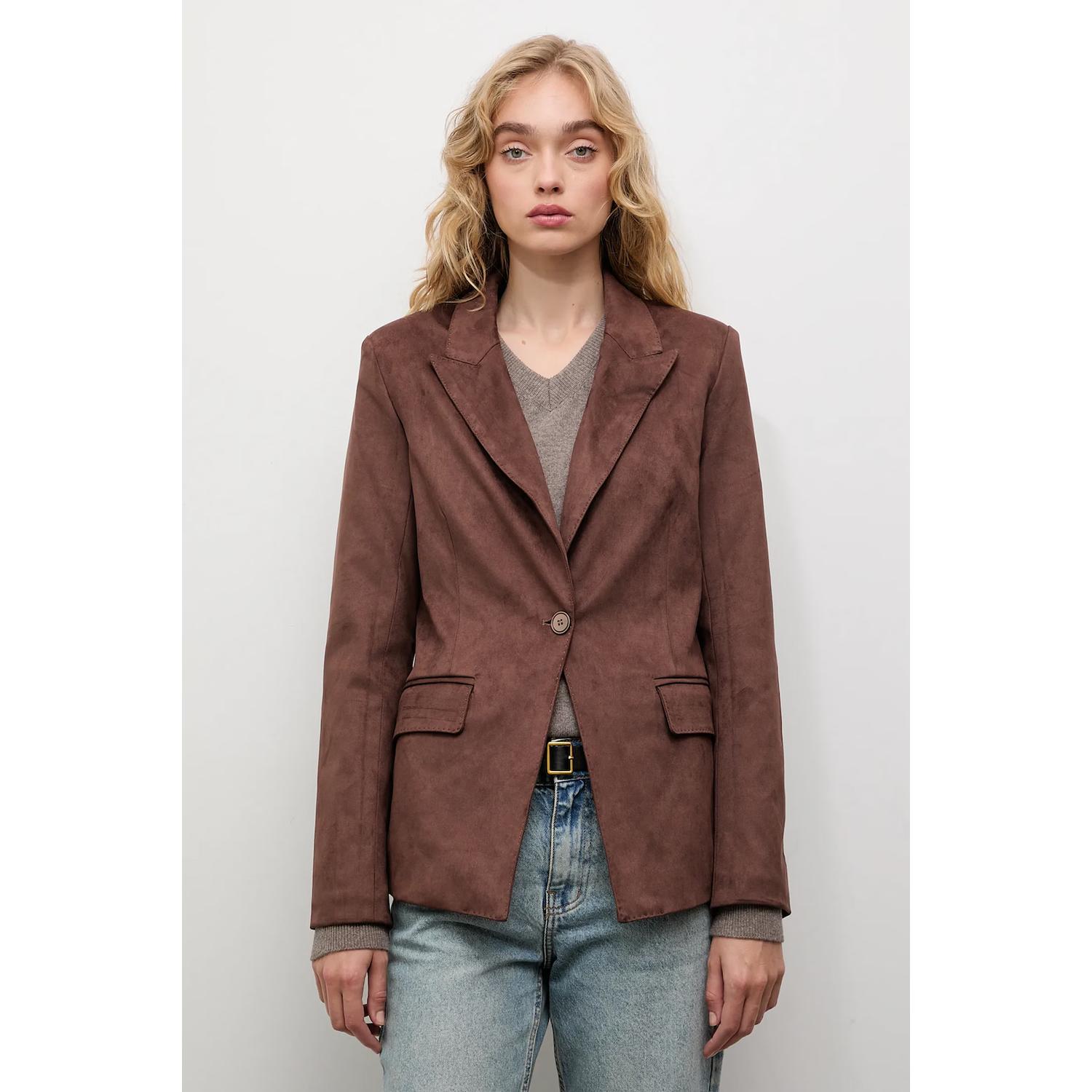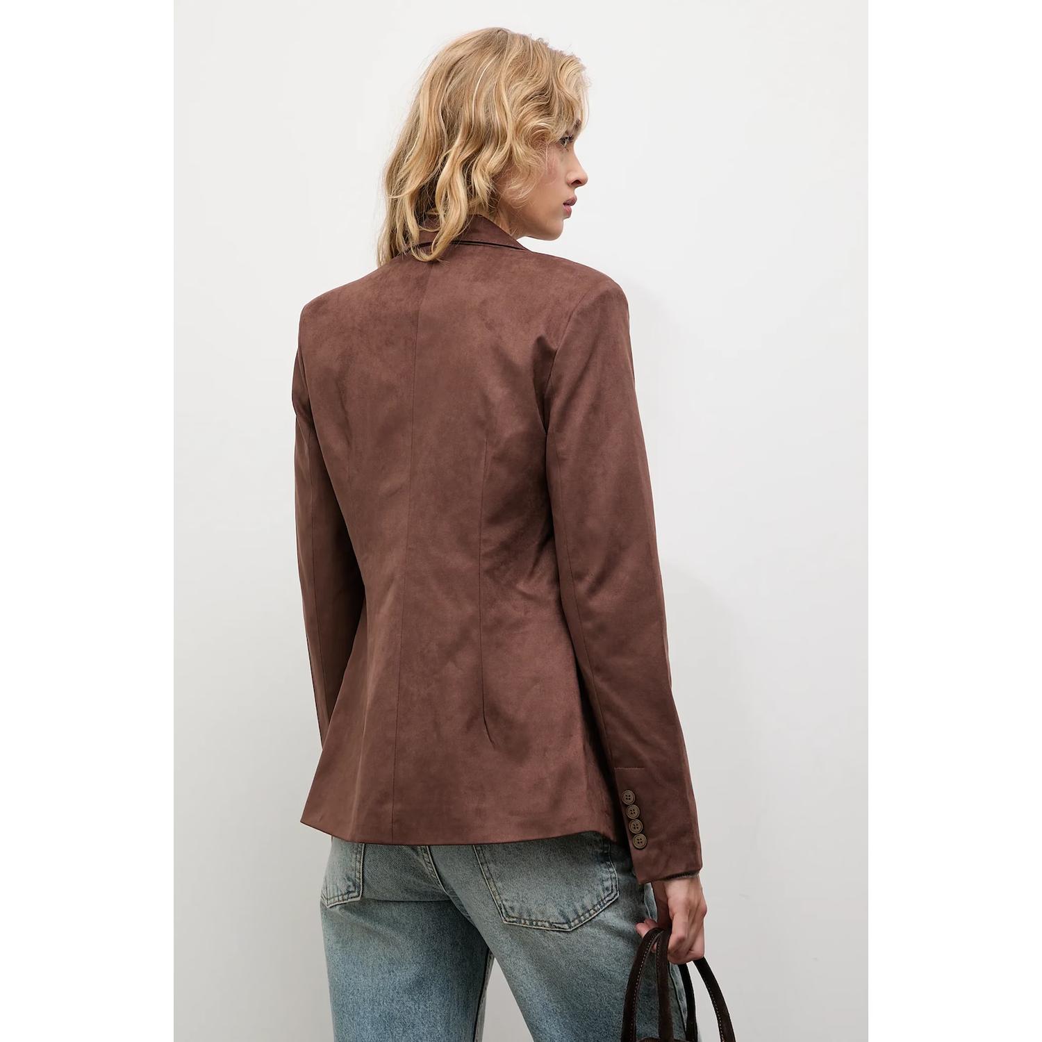 - Sacou de piele întoarsă maro clasic – rafinament natural, atemporal, ușor de adaptat oricărui stil.