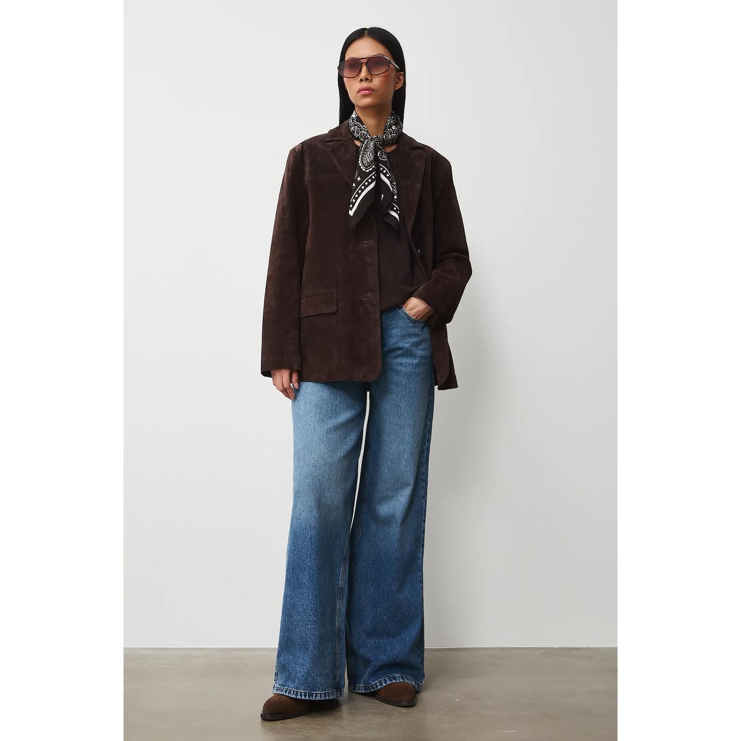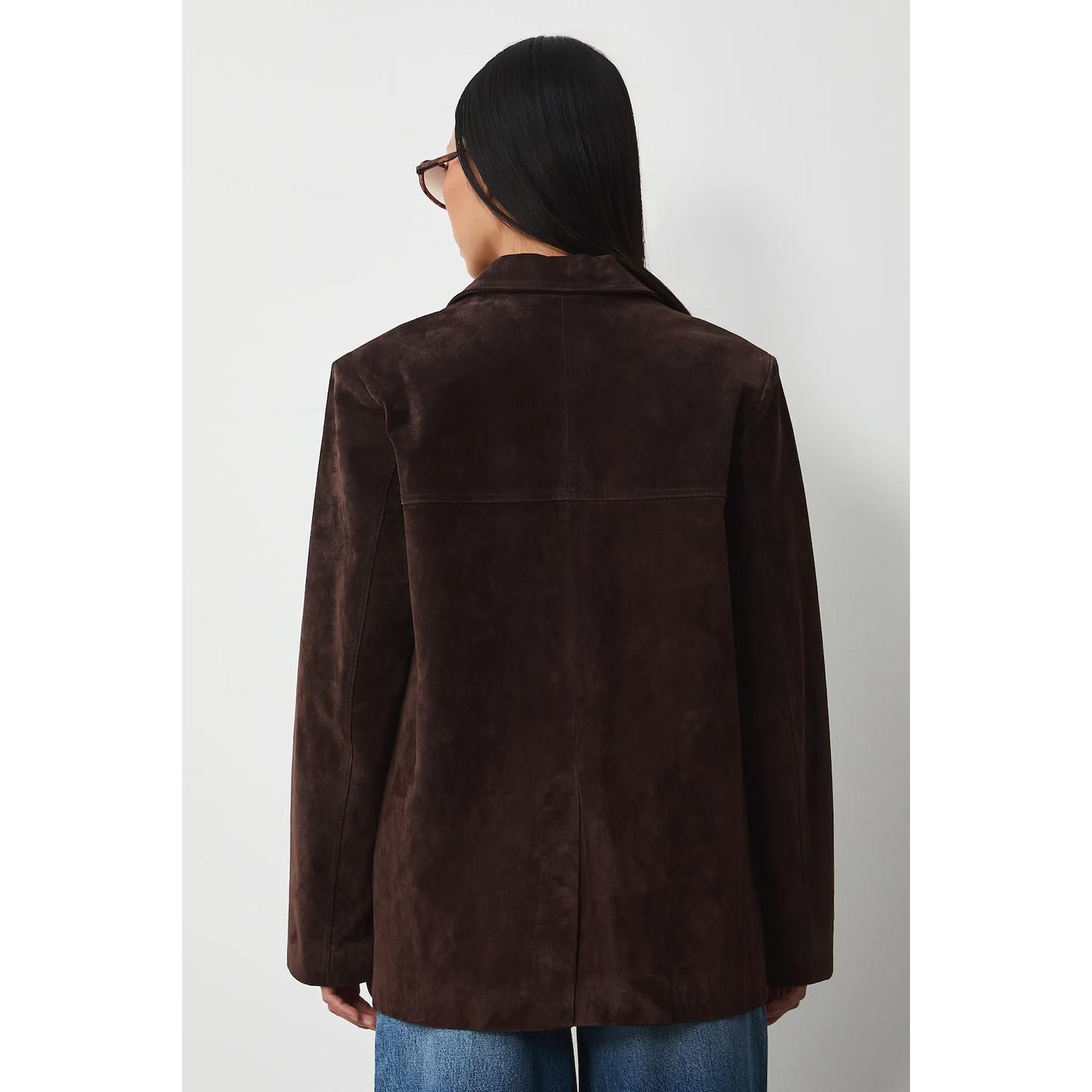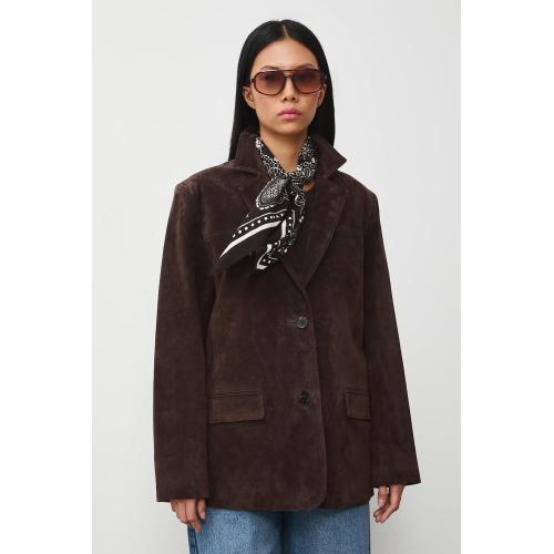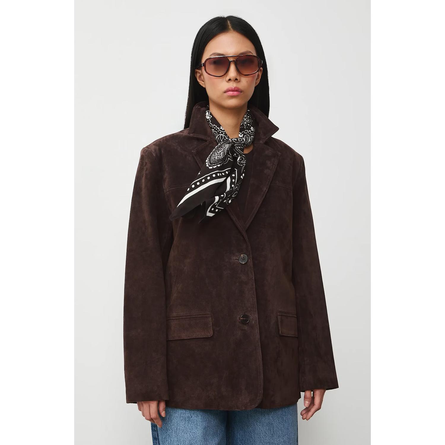 - Sacou de piele întoarsă maro clasic – rafinament natural, atemporal, ușor de adaptat oricărui stil.