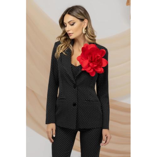 • Sacou negru cu buline si accesoriu floare maxi roșie.