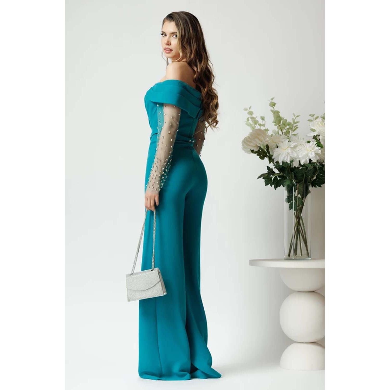 - Salopeta eleganta din crep cu mâneci din tul transparent cu strasuri argintii.