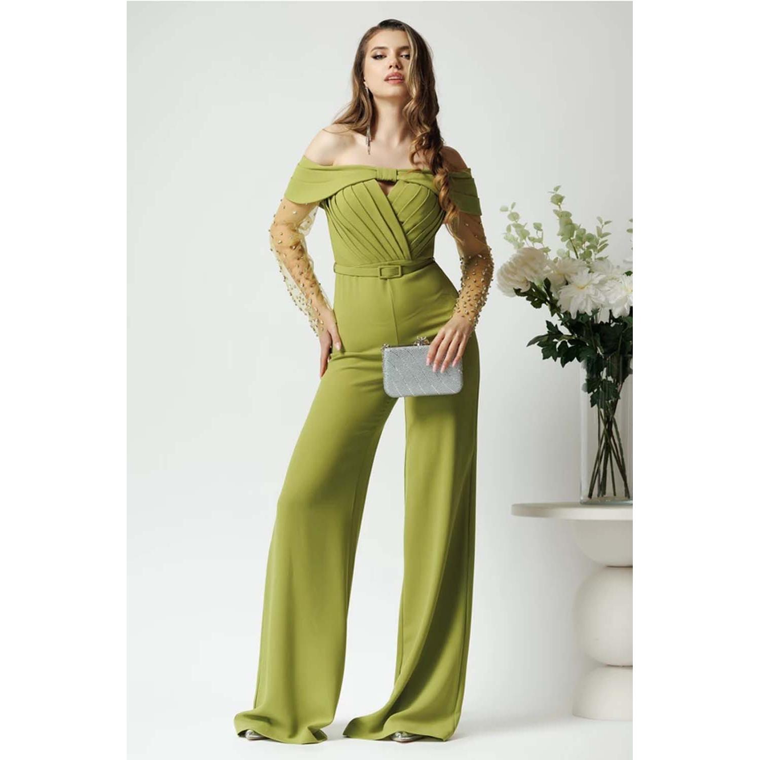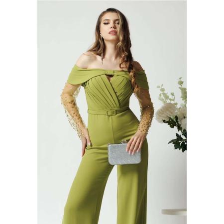 - Salopeta eleganta din crep cu mâneci din tul transparent cu strasuri argintii.