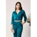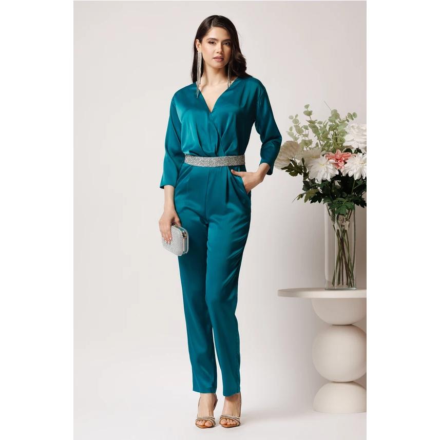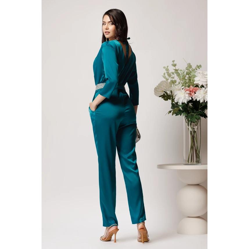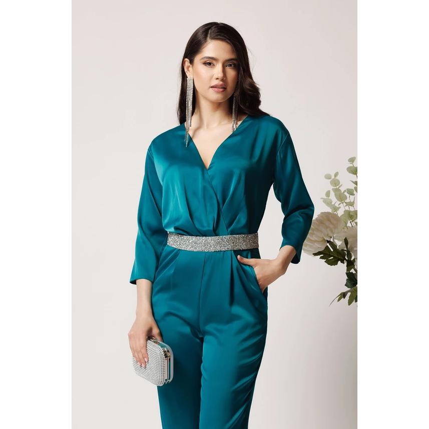 - Salopetă elegantă din saten verde, accesorizată cu o curea cu strasuri.
